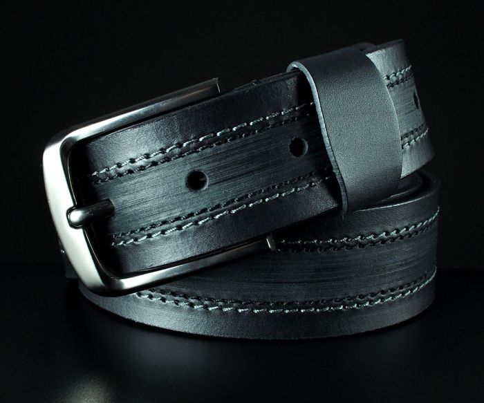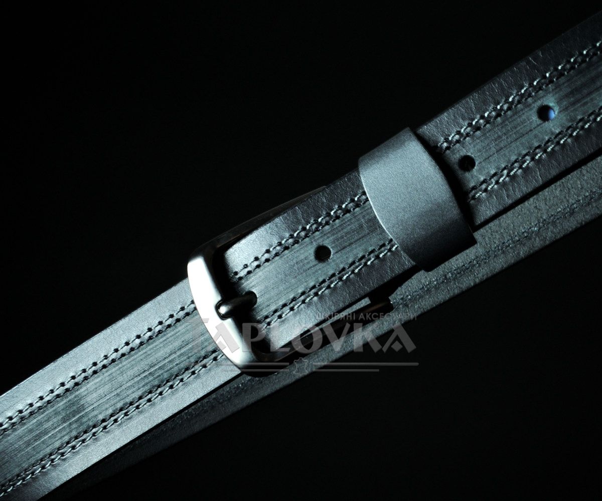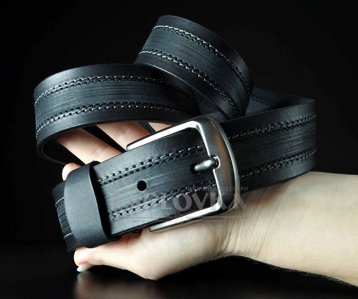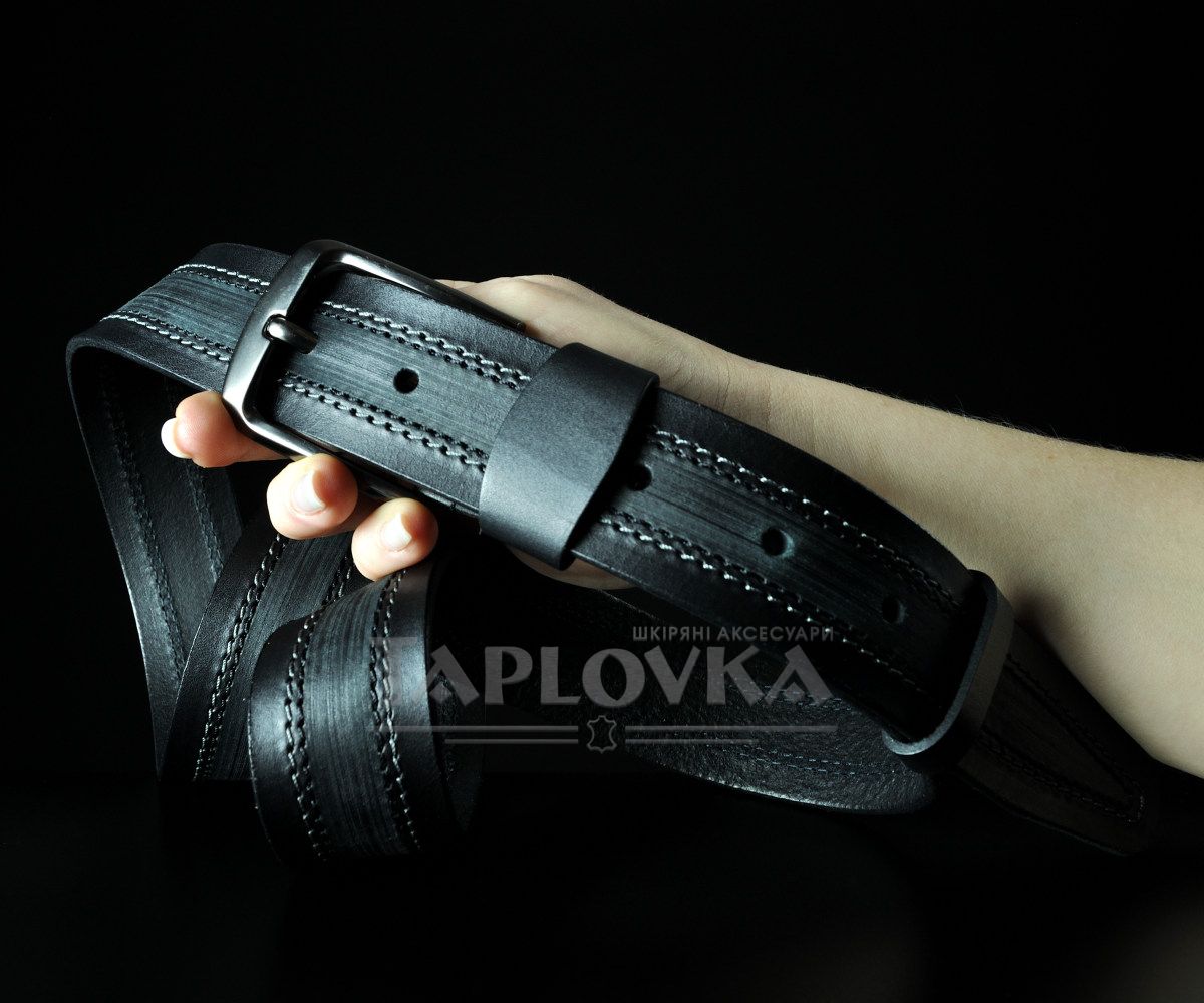 Ремінь виготовлено з добірної натуральної гладкої шкіри чорного кольору. Головна особливість моделі — складний візуальний ефект, створений за допомогою поздовжнього тиснення та двох паралельних декоративних швів, що проходять по центру полотна. Така "внутрішня" прошивка не лише додає виробу об'єму, а й додатково зміцнює структуру ременя. Модель укомплектована масивною класичною пряжкою з матовим темним покриттям, що ідеально гармонує з кольором шкіри.