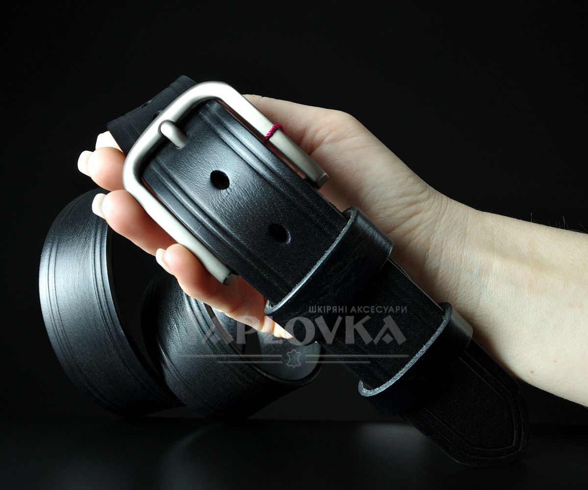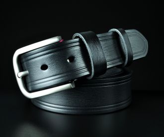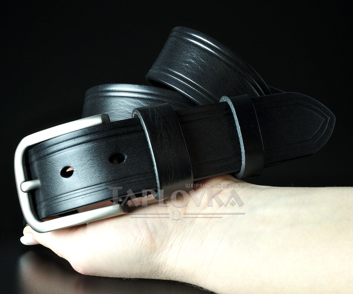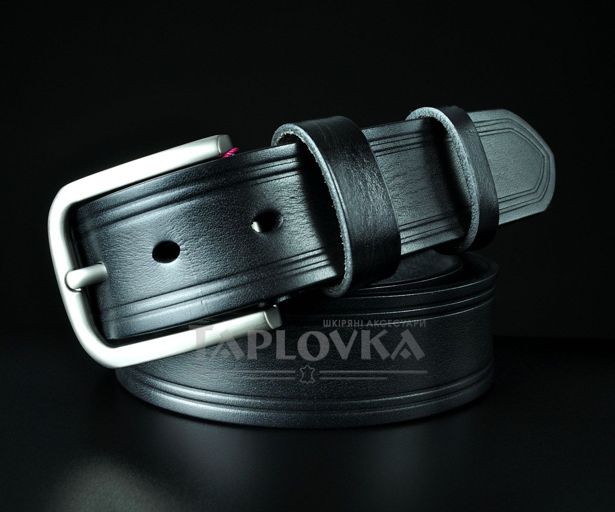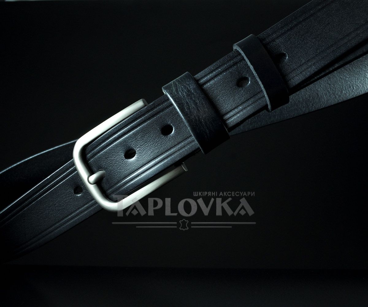 Ремінь виготовлено з цільного полотна натуральної гладкої шкіри глибокого чорного кольору. Замість традиційної прошивки, по краях виробу виконано акуратне декоративне тиснення. Це додає полотну завершеного вигляду та підкреслює його геометричну чіткість. Пряжка класична, металева, з матовою текстурою, що гармонійно поєднується зі стилем "кежуал" або повсякденним діловим образом.