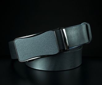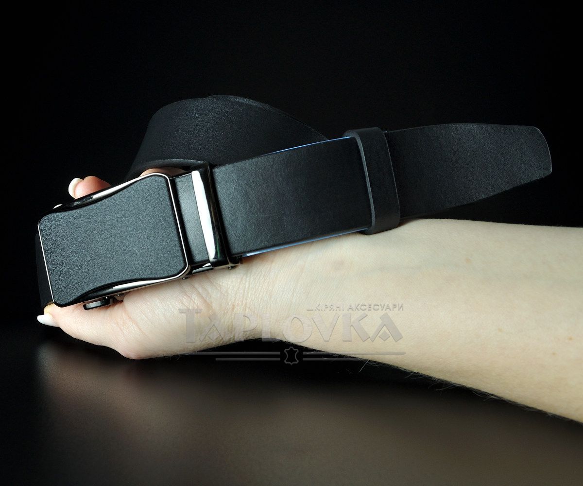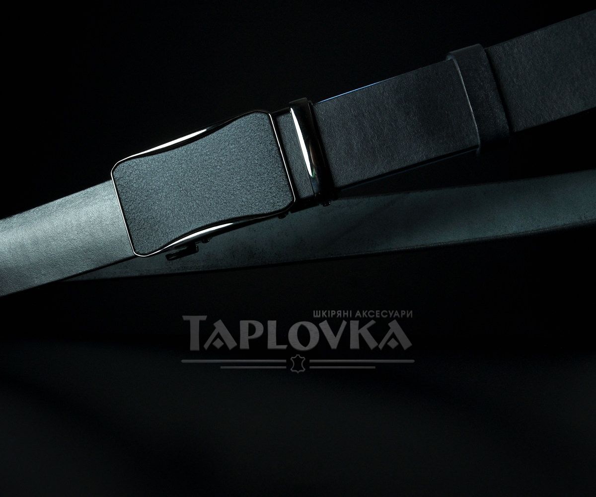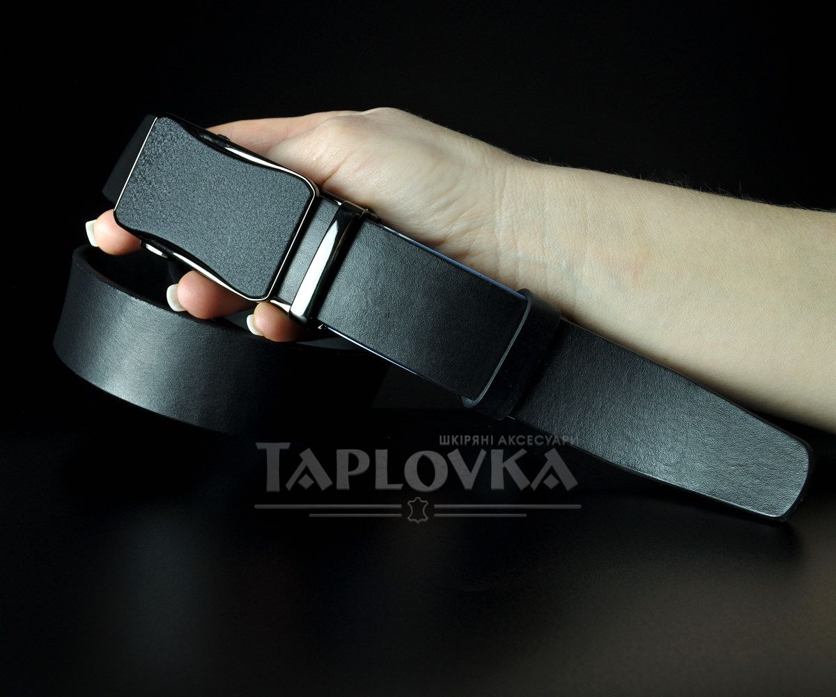 Ремінь виготовлено з добірної натуральної гладкої шкіри глибокого чорного кольору. На відміну від прошитих моделей, цей пояс має ідеально рівні краї, що підкреслює преміальну фактуру самої шкіри. Родзинка моделі — автоматична пряжка з грубим матовим покриттям. Вона не відблискує, стійка до появи відбитків пальців та дрібних подряпин, що робить аксесуар надзвичайно практичним у щоденному використанні.