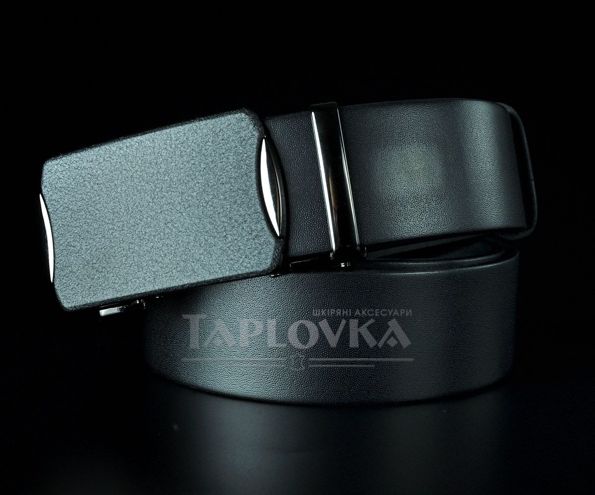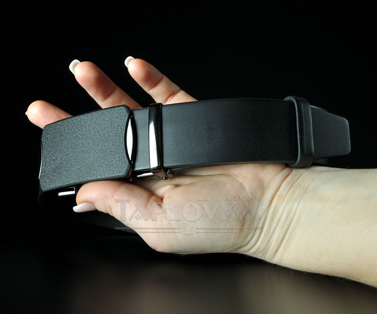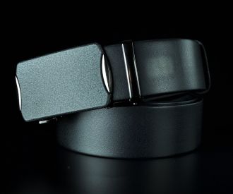 Ремінь виготовлено з добірної натуральної гладкої шкіри глибокого чорного кольору. Матеріал відрізняється високою міцністю та зносостійкістю. Головним акцентом моделі виступає автоматична пряжка з виразним крупним матовим покриттям. Така фактура надає аксесуару візуальної масивності та сучасного вигляду, при цьому вона надзвичайно практична: матова поверхня стійка до появи відбитків пальців та дрібних подряпин. Автоматичний механізм дозволяє миттєво відрегулювати довжину для ідеальної фіксації без необхідності створення отворів у полотні.