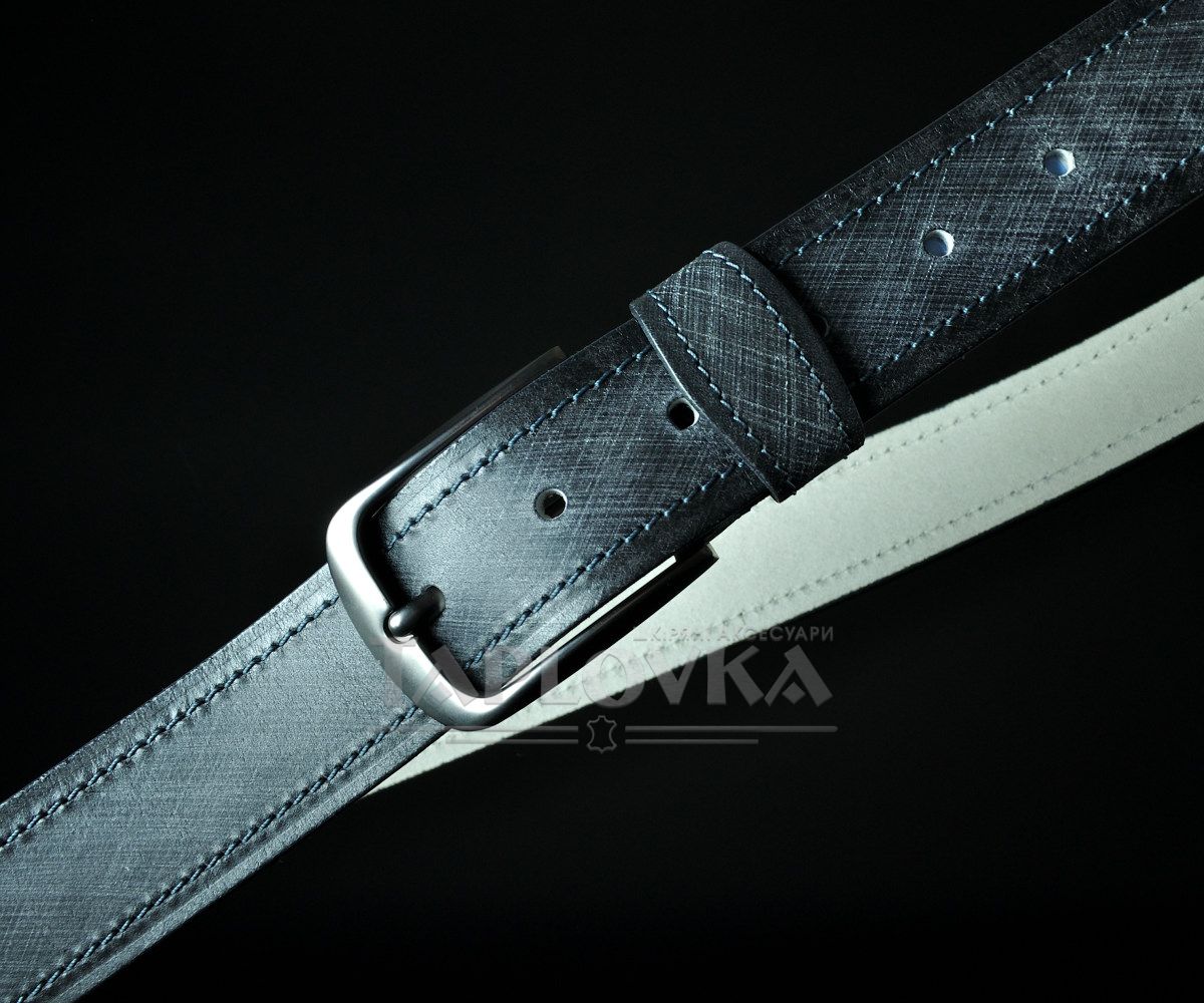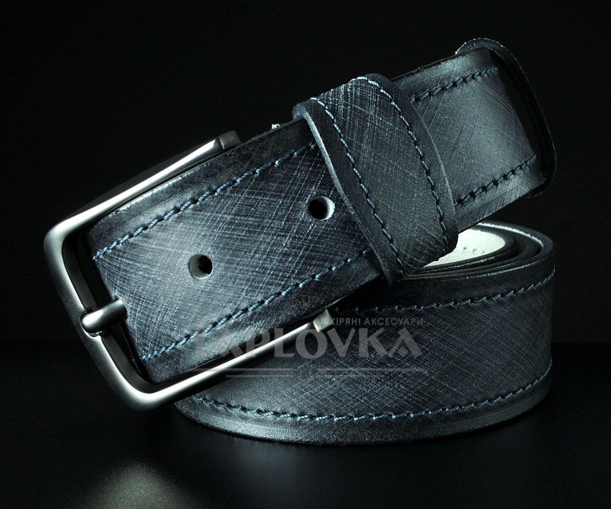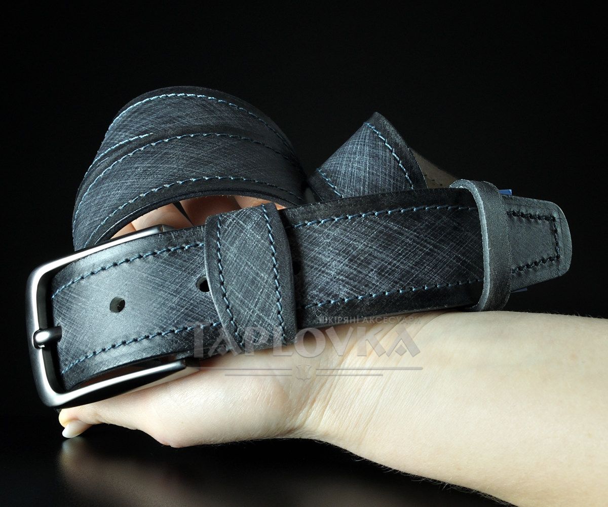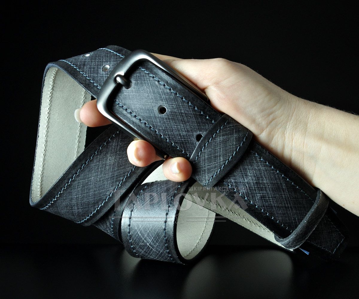 Головна "фішка" цієї моделі — унікальний візуальний ефект на поверхні шкіри. Завдяки спеціальній технології обробки, полотно має глибокий графічний малюнок, що нагадує фактурне плетіння, але при цьому сама шкіра залишається гладкою та приємною на дотик. Це створює цікаву гру світла та додає аксесуару преміального вигляду. Полотно прошите по краях міцною ниткою, а класична пряжка кольору "холодна сталь" з матовим покриттям підкреслює суворий чоловічий стиль.