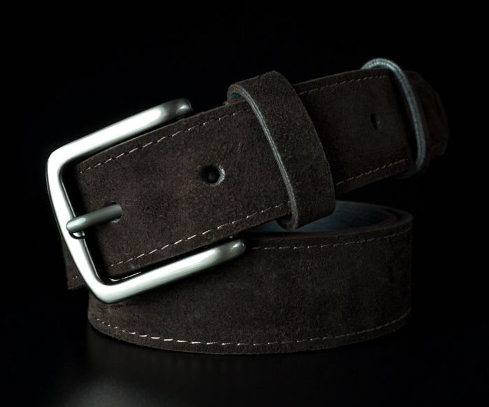 Ремінь виготовлено з добірної натуральної замші глибокого темно-коричневого кольору, що має приємну бархатисту фактуру. Важливою деталлю моделі є акуратна декоративна прострочка нитками в тон виробу по всьому периметру полотна. Це не лише додає аксесуару завершеності, а й зміцнює краї, запобігаючи деформації замші при тривалому використанні. Модель оснащена надійною класичною металевою пряжкою зі стійким покриттям, що підкреслює солідність виробу.