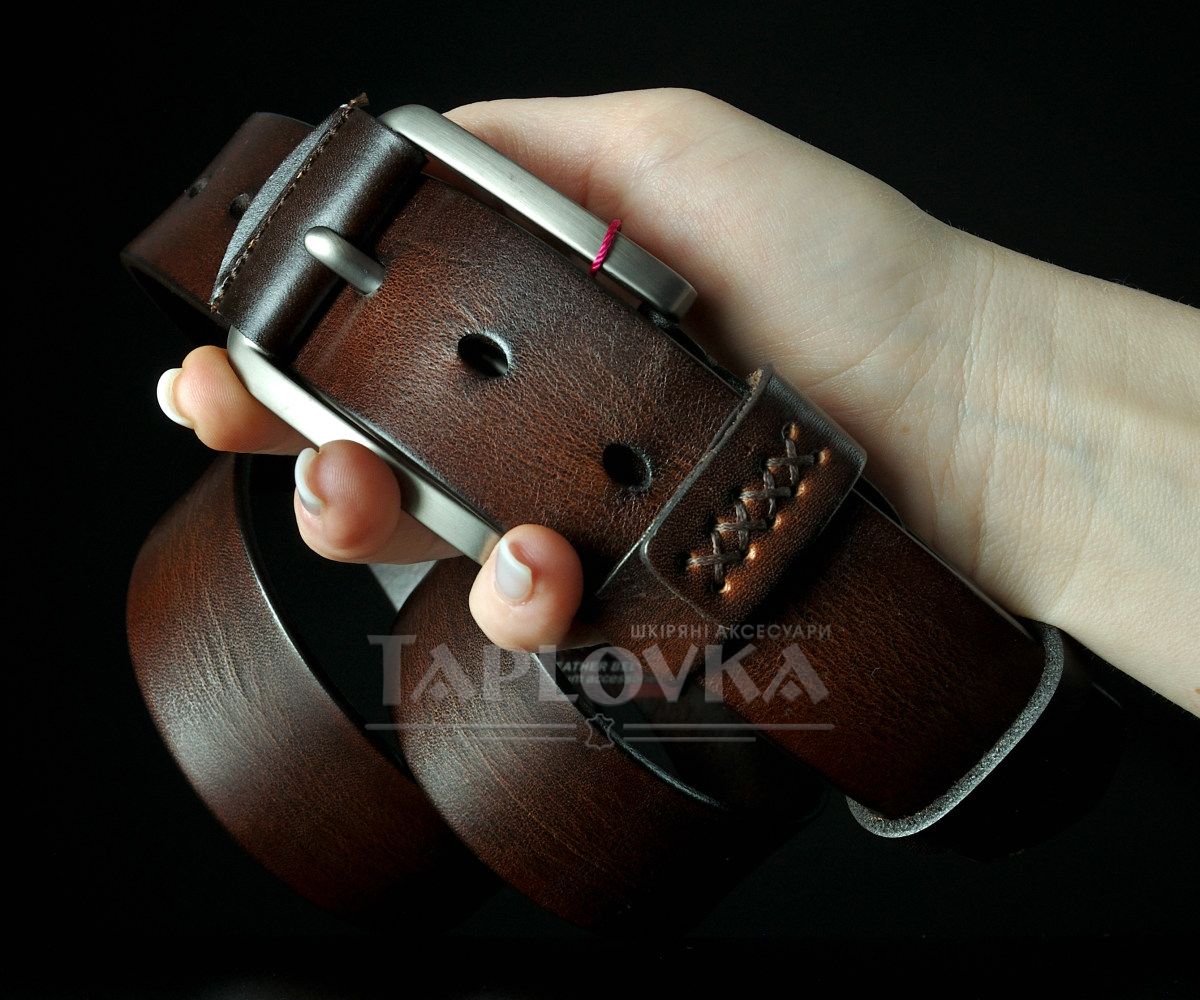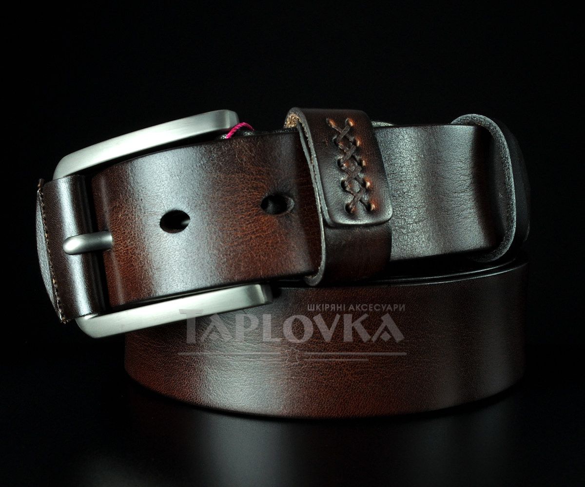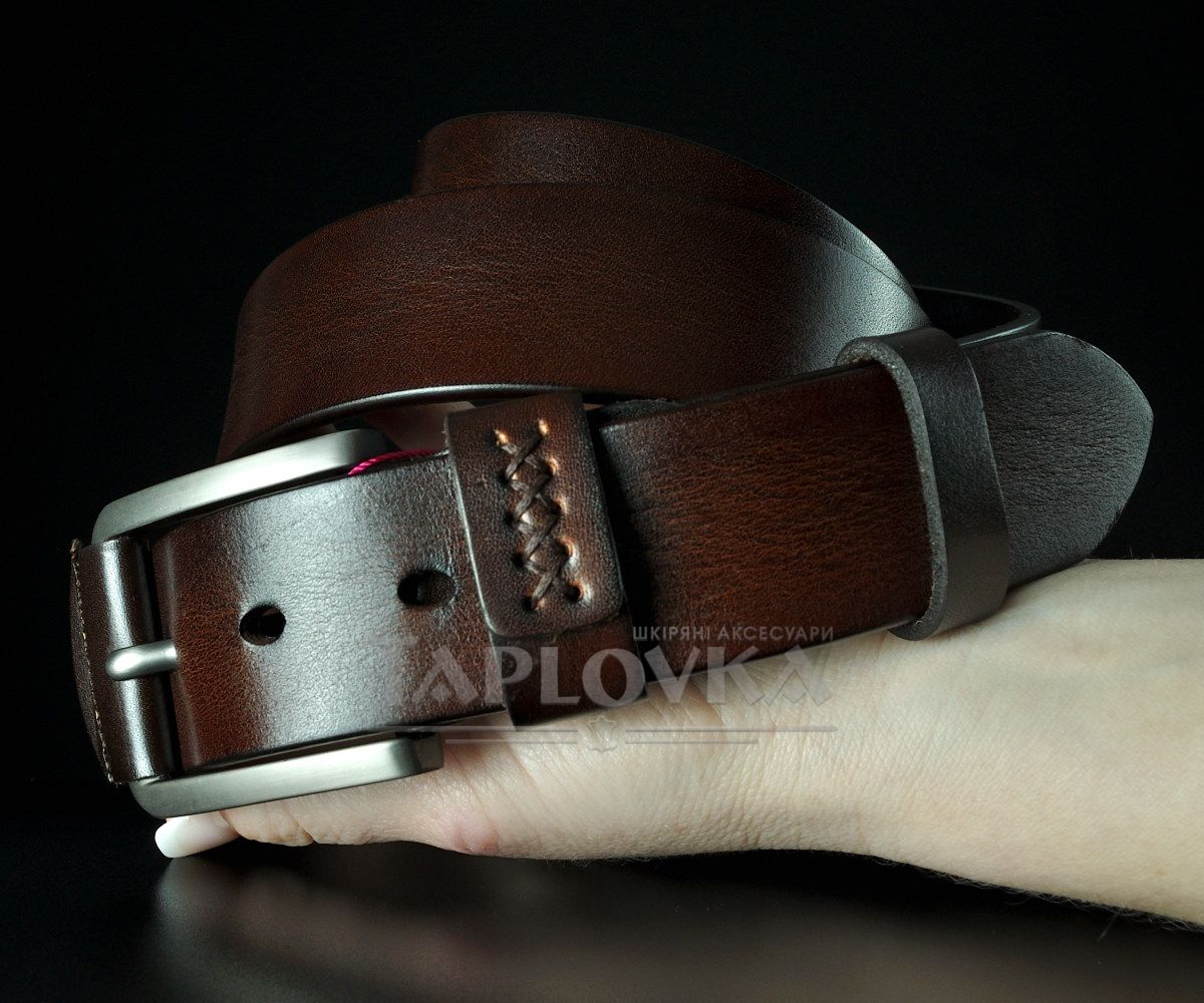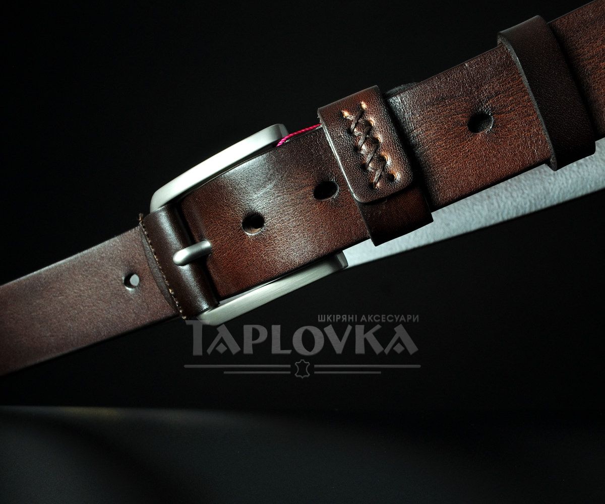 Ремінь виготовлено з добірної натуральної шкіри з гладкою матовою фактурою. Особливу увагу привертає класична металева пряжка, центральна частина якої оздоблена вставкою з ідентичної темно-коричневої шкіри. Важливий акцент моделі — прошита шлейка (тренчик). Декоративний шов на петлі не лише додає виробу крафтового вигляду, а й значно подовжує термін її служби, запобігаючи розклеюванню.
