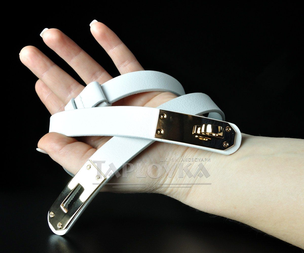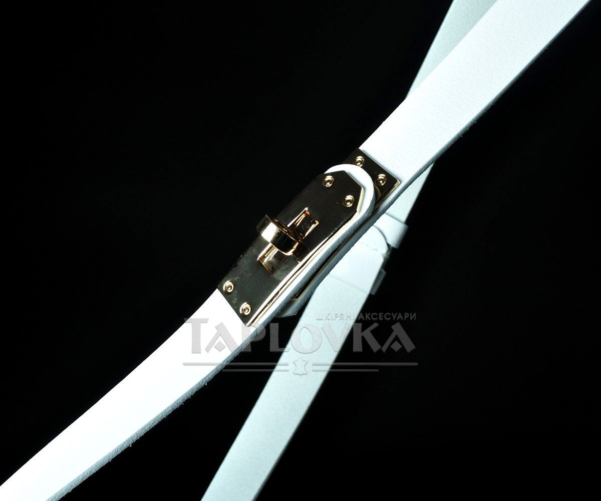 Світлий та витончений жіночий ремінь від бренду Kremen. Аксесуар виготовлено зі 100% натуральної шкіри чистого білого кольору зі слабо вираженою зернистою фактурою. Головною особливістю цієї моделі є оригінальна металева пряжка у вигляді замка золотистого кольору. Вона не лише слугує стильним акцентом, але й забезпечує плавне та зручне регулювання довжини без використання класичних отворів. Ширина полотна становить 2 см, що робить пасок універсальним доповненням для створення світлих і ніжних образів.