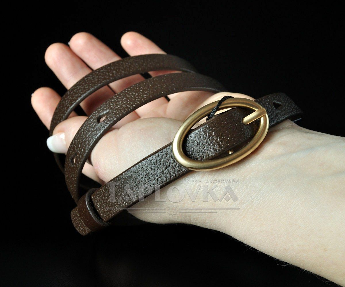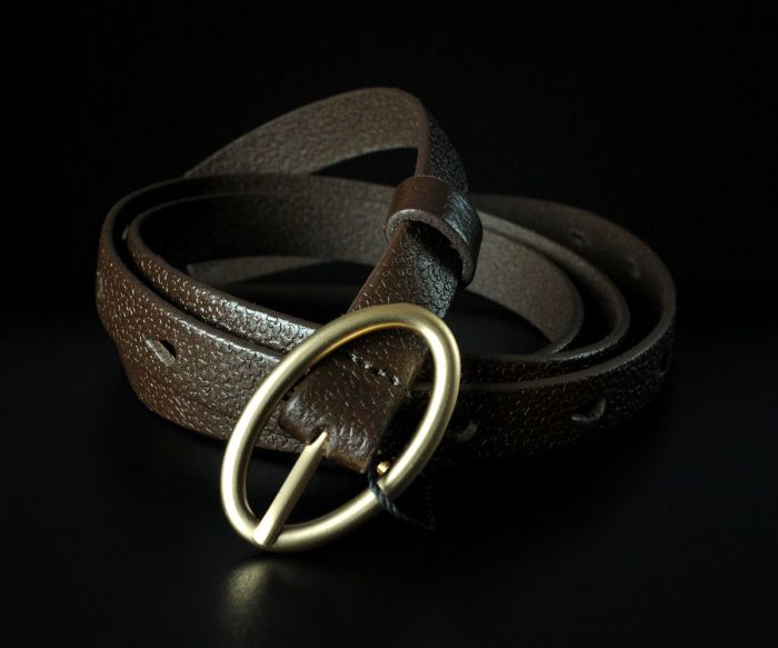 Елегантний вузький жіночий ремінь від українського бренду Kremen. Виріб виготовлено зі 100% натуральної шкіри в універсальному коричневому кольорі зі слабо вираженою зернистою фактурою. Особливістю цієї моделі є оригінальна металева овальна пряжка-качелька золотистого кольору, яка виглядає ніжно та нестандартно. Завдяки акуратній ширині 1,5 см, цей пасок ідеально підходить для підкреслення талії на сукнях, туніках, подовжених сорочках або як витончене доповнення до класичних штанів.
