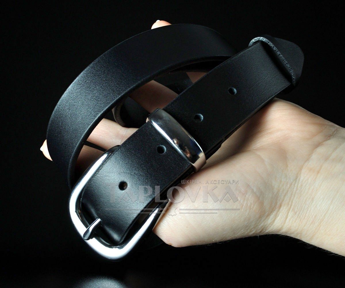 Базова модель жіночого ременя від українського бренду Sfip. Цей аксесуар повністю виготовлений зі 100% натуральної шкіри чорного кольору з рівною гладкою фактурою. Виріб має стандартну ширину 3 см, що робить його зручним для використання з більшістю моделей штанів та джинсів. Дизайн доповнює надійна металева пряжка класичної форми у світлому відтінку нікель.