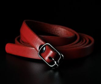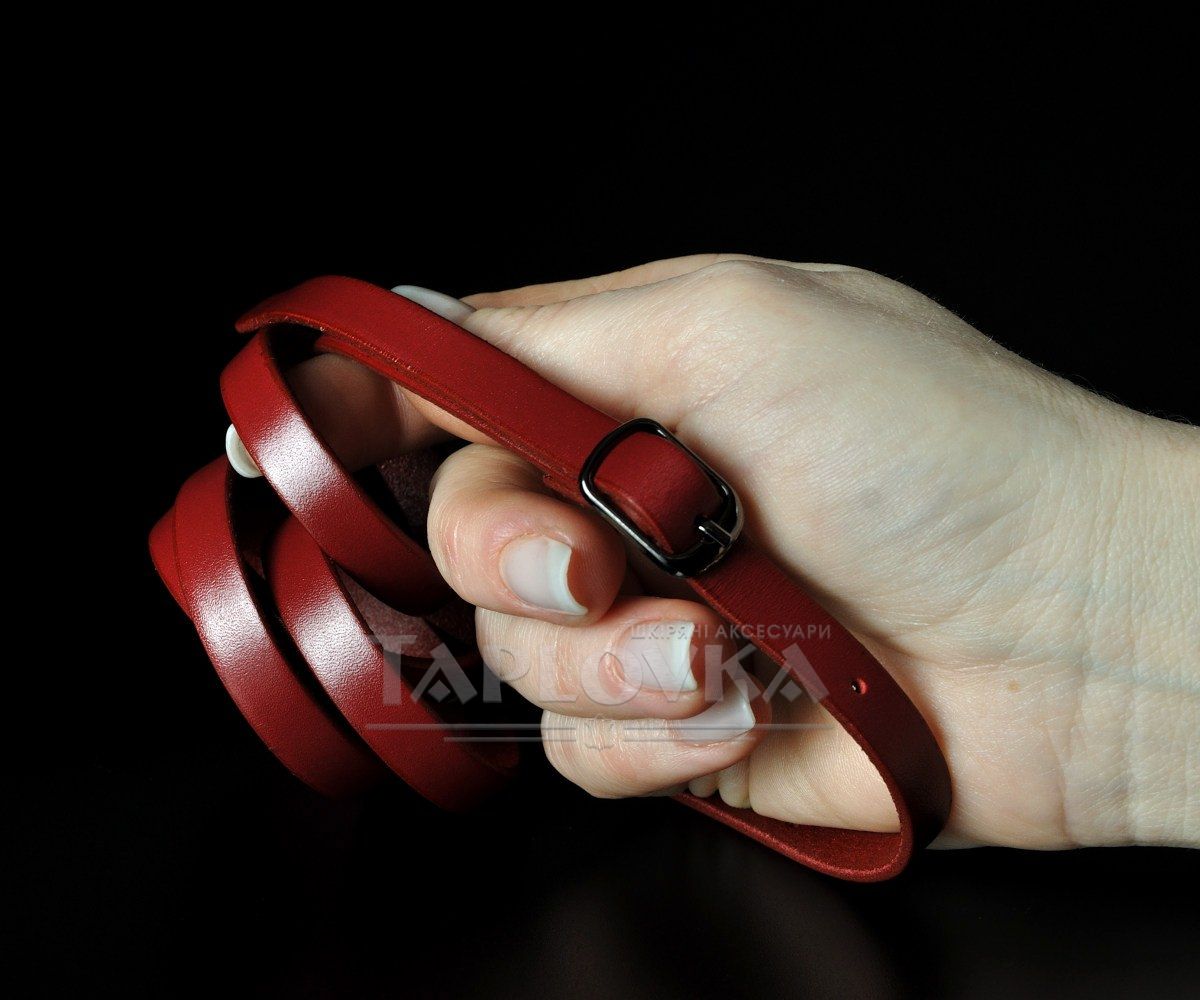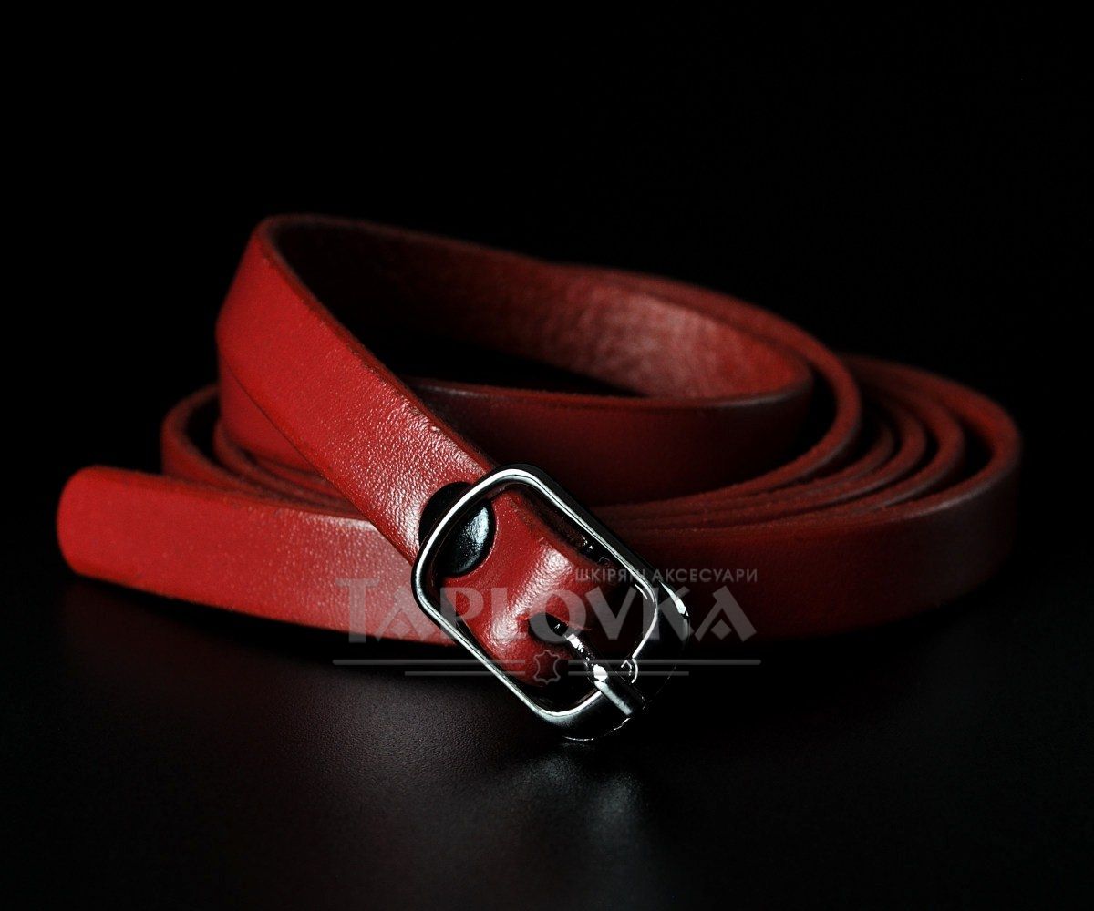 Елегантний тонкий жіночий ремінь від українського бренду Kremen. Аксесуар виготовлено зі 100% натуральної шкіри насиченого червоного кольору з ідеально рівною, гладкою фактурою. Виразним акцентом моделі є мініатюрна металева пряжка-качелька, виконана в ефектному кольорі чорний глянець. Завдяки мінімальній ширині всього 1 см, цей пасок створений для делікатного підкреслення талії на сукнях, туніках, подовжених сорочках або легких кардиганах.