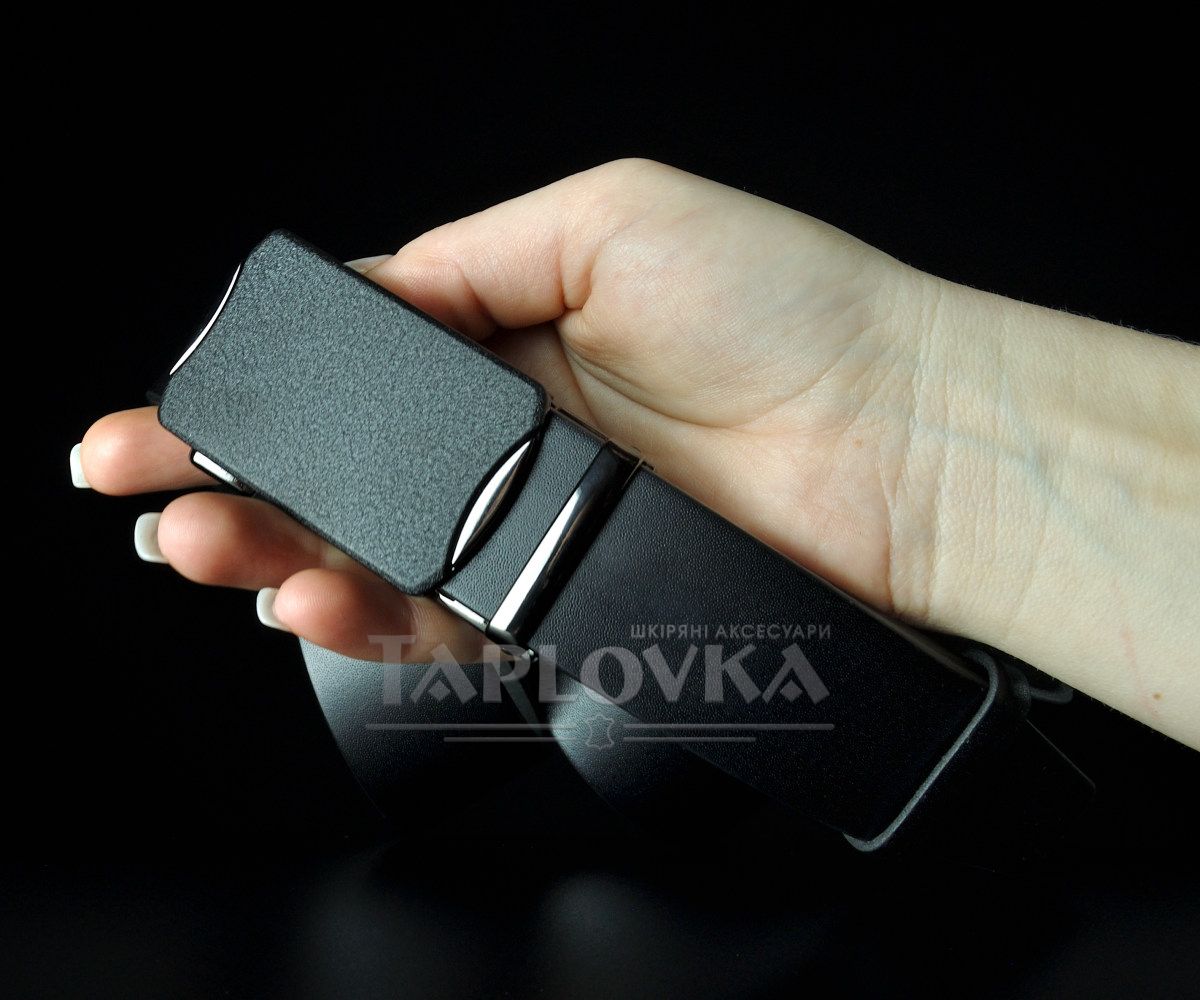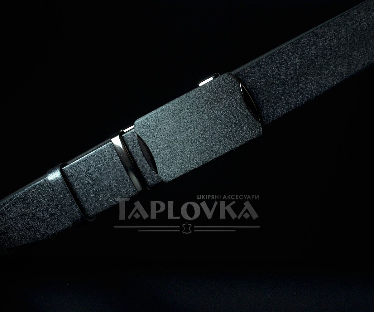 Ремінь виготовлено з добірної натуральної гладкої шкіри глибокого чорного кольору. Матеріал відрізняється високою міцністю та зносостійкістю. Головним акцентом моделі виступає автоматична пряжка з виразним крупним матовим покриттям. Така фактура надає аксесуару візуальної масивності та сучасного вигляду, при цьому вона надзвичайно практична: матова поверхня стійка до появи відбитків пальців та дрібних подряпин. Автоматичний механізм дозволяє миттєво відрегулювати довжину для ідеальної фіксації без необхідності створення отворів у полотні.