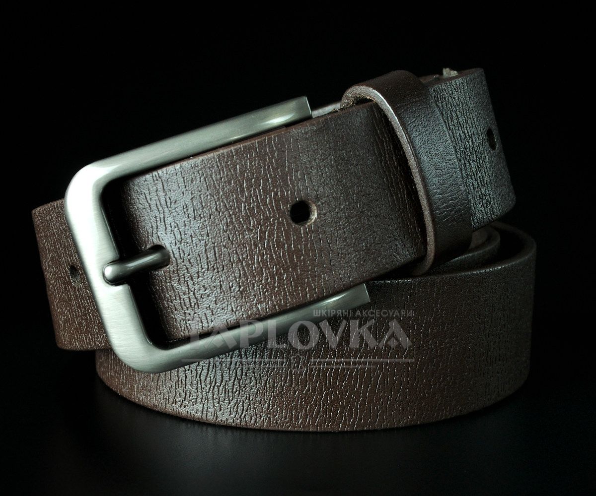 Ремінь виготовлено з добірної натуральної шкіри у глибокому коричневому відтінку. Головною особливістю моделі є виражена структурна фактура полотна, яка надає виробу індивідуальності та візуальної глибини. Така поверхня є надзвичайно практичною у щоденному носінні: вона стійка до появи дрібних подряпин та зношування. Аксесуар оснащений надійною класичною металевою пряжкою зі стійким покриттям, що підкреслює стриманий стиль та гарантує тривалий термін експлуатації.