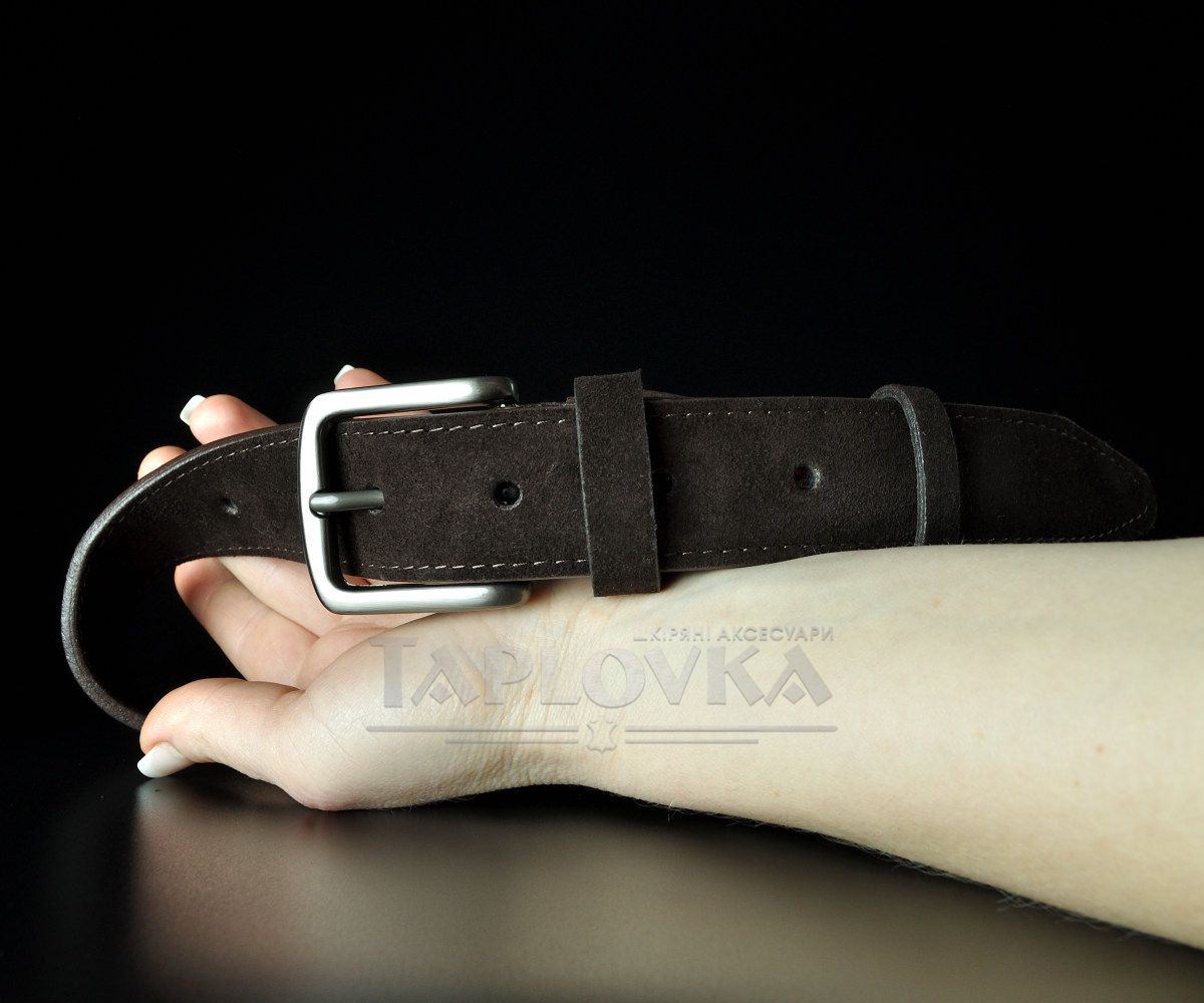 Ремінь виготовлено з добірної натуральної замші глибокого темно-коричневого кольору, що має приємну бархатисту фактуру. Важливою деталлю моделі є акуратна декоративна прострочка нитками в тон виробу по всьому периметру полотна. Це не лише додає аксесуару завершеності, а й зміцнює краї, запобігаючи деформації замші при тривалому використанні. Модель оснащена надійною класичною металевою пряжкою зі стійким покриттям, що підкреслює солідність виробу.
