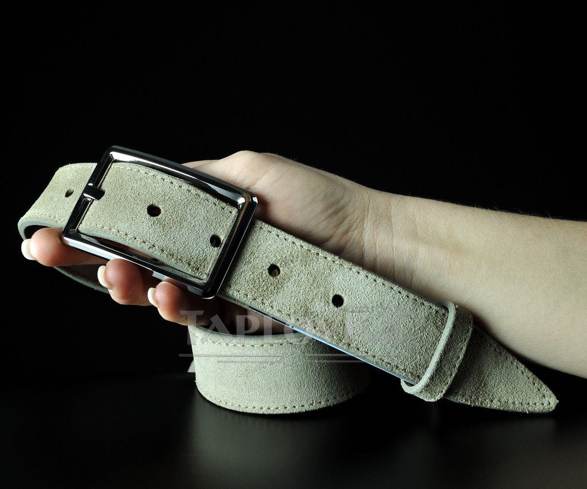 Елегантний та універсальний ремінь (унісекс), виготовлений з добірного натурального замшу шляхетного бежевого відтінку. Модель без гендерних обмежень, підходить як для чоловічого, так і для жіночого гардероба. Завдяки класичній ширині 3,5 см, аксесуар бездоганно пасує до ділових костюмів, класичних штанів та джинсів.