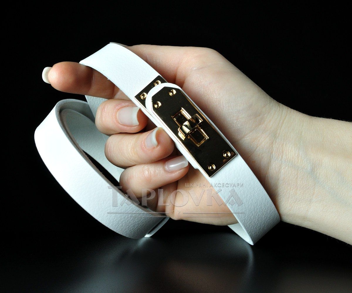 Світлий та витончений жіночий ремінь від бренду Kremen. Аксесуар виготовлено зі 100% натуральної шкіри чистого білого кольору зі слабо вираженою зернистою фактурою. Головною особливістю цієї моделі є оригінальна металева пряжка у вигляді замка золотистого кольору. Вона не лише слугує стильним акцентом, але й забезпечує плавне та зручне регулювання довжини без використання класичних отворів. Ширина полотна становить 2 см, що робить пасок універсальним доповненням для створення світлих і ніжних образів.