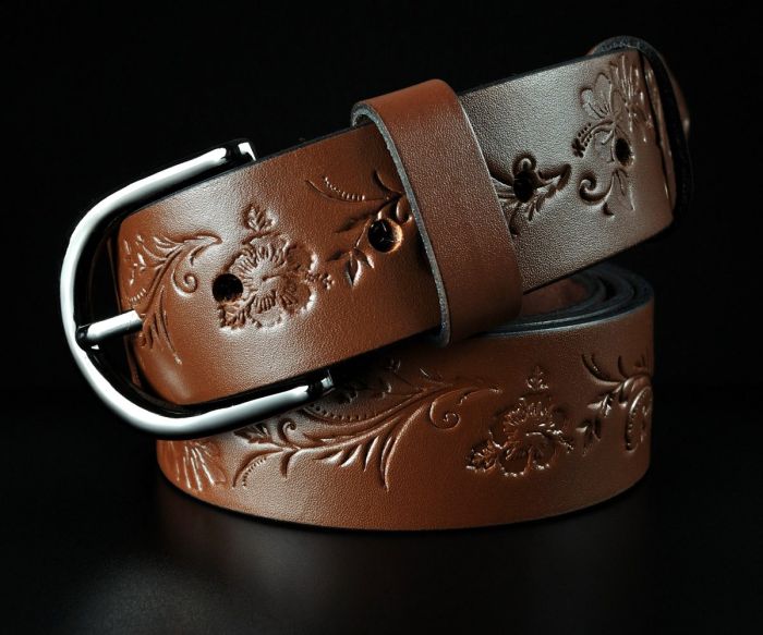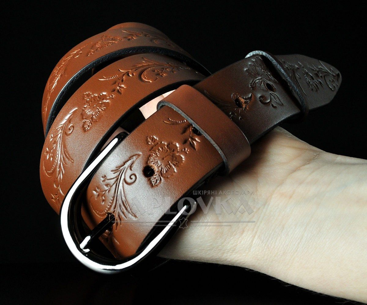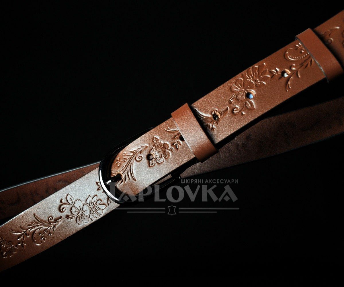 Жіночий шкіряний ремінь Sfip світло-коричневий, з квітковим тисненням (3,5 см)