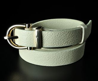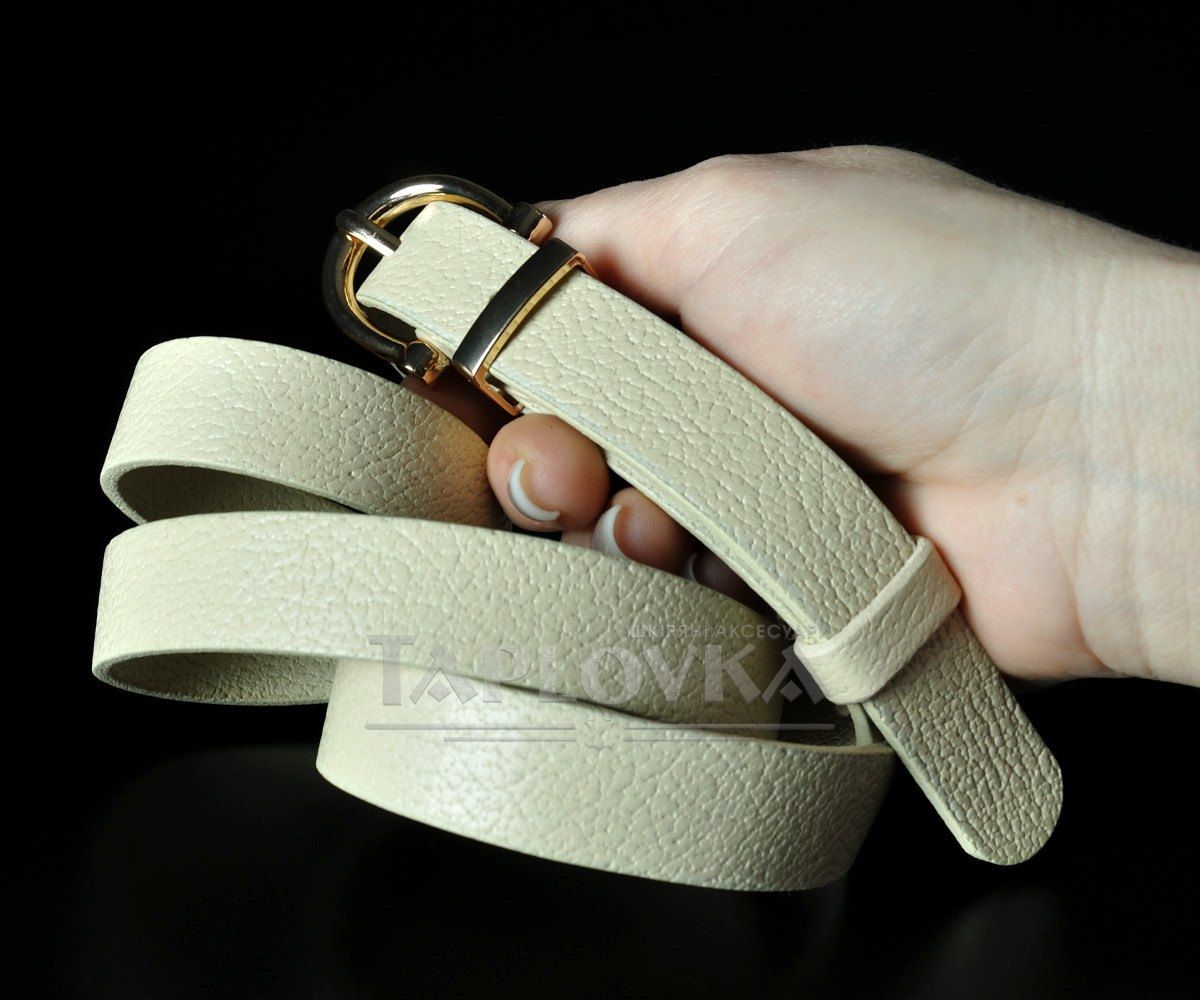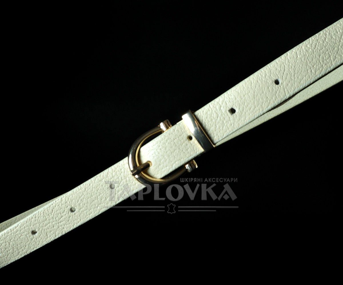 Елегантний вузький жіночий ремінь турецького виробництва. Аксесуар виготовлено зі 100% натуральної шкіри ніжного молочного кольору з вираженою зернистою фактурою. Модель гармонійно доповнена металевою класичною напівкруглою пряжкою золотистого кольору. Завдяки делікатній ширині 2 см, цей пасок є універсальним вибором: він чудово підходить для підкреслення талії на сукнях, туніках, подовжених сорочках, а також стане стильним доповненням для світлих штанів.